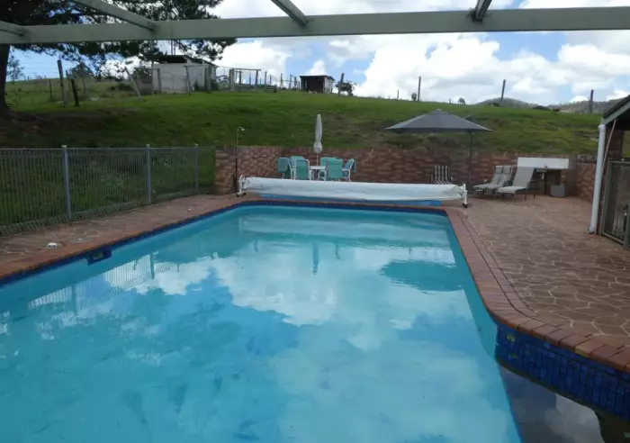 Huge 5 bedroom, brick, ranch style home, set back from the road with northerly aspect, no close neighbours on no through road. All rooms have sliding doors opening onto the verandah allowing cross breezes in summer. Separate lounge with cosy combustion fire, R/C air con for all year round comfort, new carpet plus sliding door to verandah. The dining room with tiled floors for easy maintenance is adjacent to the family room also with double sliding doors leading to front verandah. Lovely modern kitchen with B/Bar. 4 big bedrooms all with BIR's, fans and sliding doors leading to front verandah. The main bedroom which is located at one end of the home is of huge proportions with 2 WIR's, ensuite with spa bath and sliding door leading to private courtyard. At the other end of the home is a big rumpus room with sliding door, 4 BIR's and new carpet, easily converted to 2 family accommodation. Solar HWS and 2 laundries. Outside there is a DLUG, 6 bay shed 18.5 x 7.5 with 2 bays enclosed as games room, plus 2nd shed 15 x 9.5, 2 doors, insulated, concrete floor, fan, power and office. 2 stables, good yards, sparkling inground pool with deep end, cubby house, NBN and chook pen. Set on 50 gently undulating acres, mainly cleared, fenced into 5 paddocks with 5 dams. Private location 20 minutes Taree or Wingham, 40 minutes Forster beaches/shops.