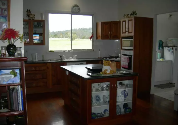 Kitchen 4 x 3.4 polished floors, timber cupbaords, D/W, gas, WI pantry