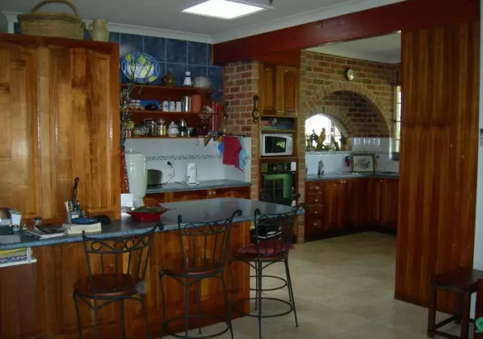 Kitchen 6.8 x 3.1 timber, brick feature, B/Bar, D/W