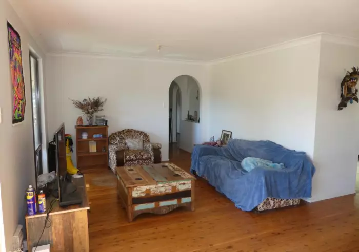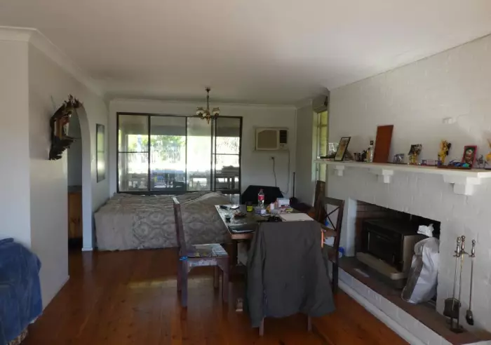 Well built Hardiplank and Colorbond ranch style home with Northerly aspect. Home set well back from the road ensuring privacy and rural views from front verandah. Spacious lounge/dining with timber flooring, cosy combustion fire and sliding door to verandah. Big kitchen needing TLC with timber flooring. 3 good sized bedrooms all with timber flooring, 1 with BIR's. Original bathroom (needing reno). Dowstairs double garage with 3 roller doors, rumpus room 7.6m x 3.6m, office 4.5m x 3.6m , small kitchenette needs TLC with basic shower and WC. Big back, timber deck needs replacing and side verandah needs attention. Double Colorbond carport and 2 stables. Set on gently undulating 11 acres, all cleared, fenced into 2 paddocks with 1 dam and the convenience of town water. Well built home 1980's just needing TLC to restore. Suit tradie or young couple's first home. Just 6 kms from highway and village. Zoned RU4 Primary Production Small Lots. BE QUICK WON"T LAST