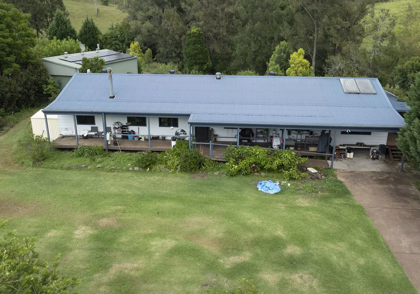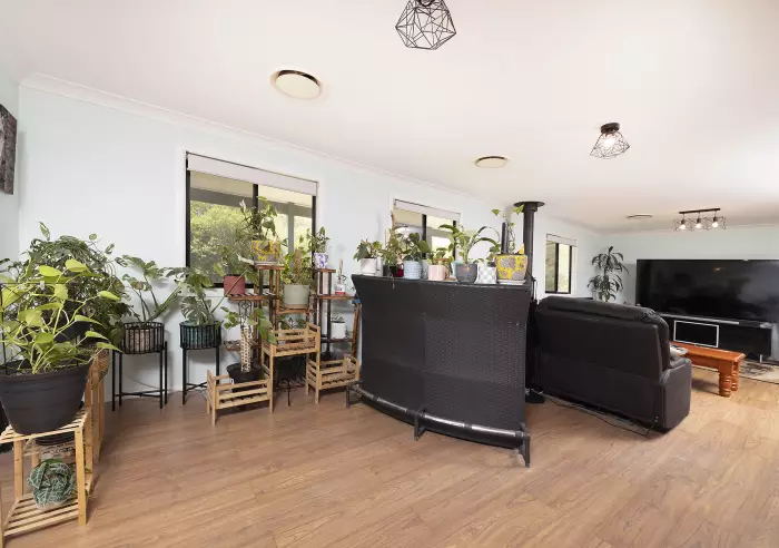 Separate to the home is a large machinery shed, to store the mowers and tools, also including accommodation ideal for guests or as a teenage retreat.  The property is set on 5 fertile acres, mainly flat, fenced into 2 paddocks, and has large water tank storage; external water is accessed from the creek, and the property would be suitable for farm animals or a horse or 2.